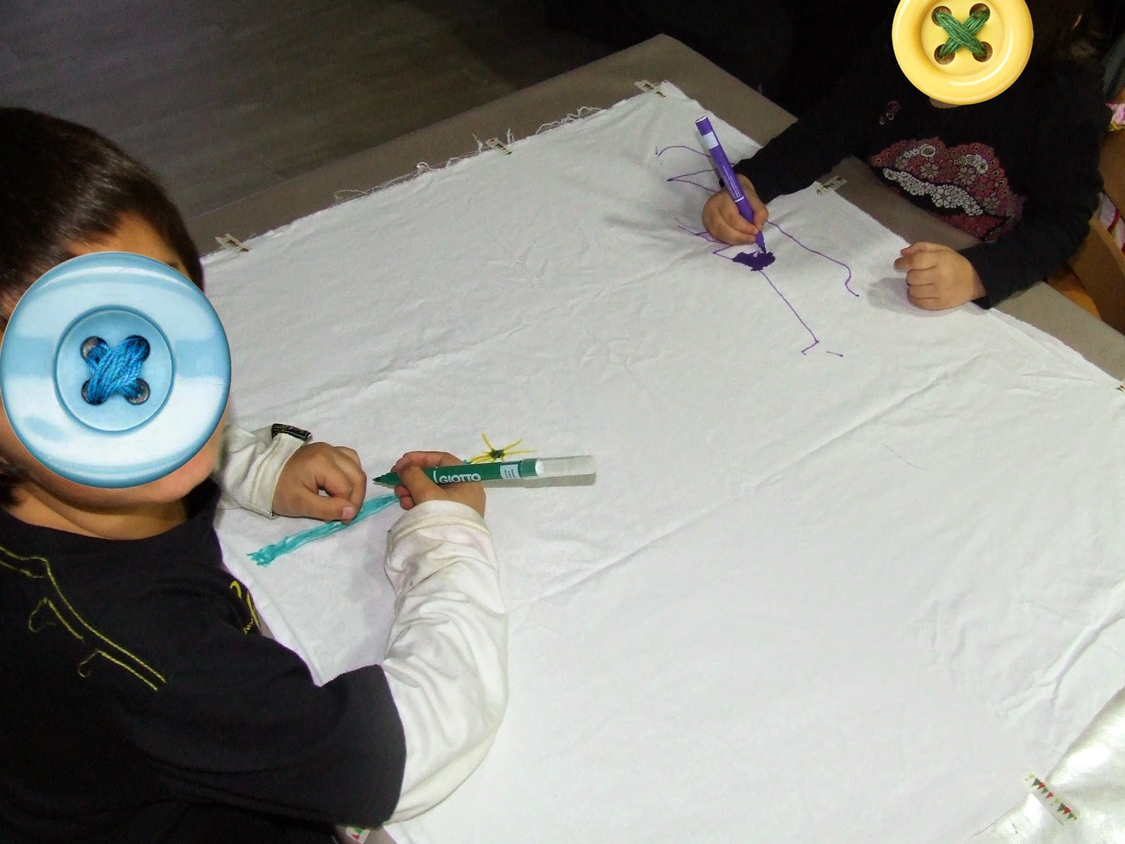 Mis hijos, pintando una tela blanca de sábana con rotuladores de tela. Dibujo libre, por supuesto!!
